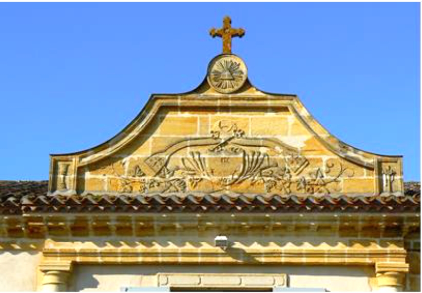 Le tout est surmonté d’une croix reposant sur un disque décoré du triangle de la Trinité d’où jaillissent des rayons. A gauche, on remarque un calice et à droite une croix avec une couronne.